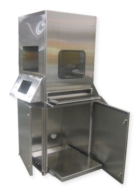 Multi sided control cabinet with slide out keyboard and Lexan window.