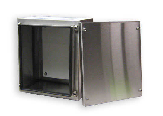 Gasketed junction box with captive latching. Painted white subpanel. This specific job is used in the waste water industry.